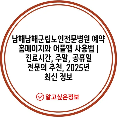 남해남해군립노인전문병원 예약 홈페이지와 어플앱 사용법 | 진료시간, 주말, 공휴일 전연락 추천, 2025년 최신 정보 에 대해 자주 묻는 질문 TOP 5
