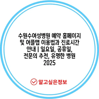 수원수여성병원 예약 홈페이지 및 어플앱 이용법과 진료시간 공지 | 일요일, 공휴일, 전연락 추천, 유명한 병원 2025에 대한 내용을 소개합니다.