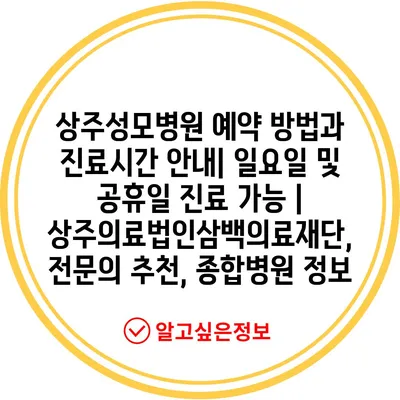 상주성모병원 예약 방법과 진료시간 공지| 일요일 및 공휴일 진료 가능 | 상주의료법인삼백의료재단, 전연락 추천, 종합병원 정보에 대해 자주 묻는 질문 TOP 5