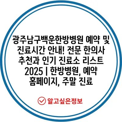 광주남구백운한방병원 예약 및 진료시간 공지! 전문 한의사 추천과 인기 진료소 리스트 2025 | 한방병원, 예약 홈페이지, 주말 진료에 대해 자주 묻는 질문 TOP 5