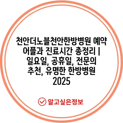 천안더노블천안한방병원 예약 어플과 진료시간 총정리 | 일요일, 공휴일, 전연락 추천, 유명한 한방병원 2025는 여러분의 건강을 위해 꼭 필요한 정보입니다.