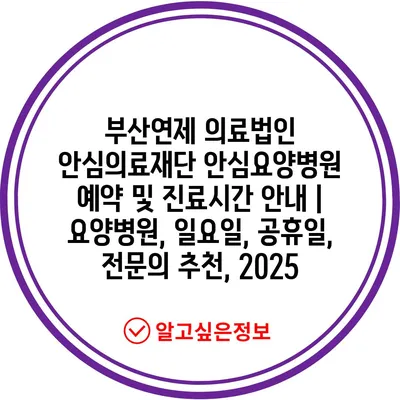 부산연제 의료법인 안심의료재단 안심요양병원 예약 및 진료시간 공지 | 요양병원, 일요일, 공휴일, 전연락 추천, 2025 에 대해 자주 묻는 질문 TOP 5