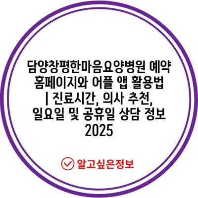 담양창평한마음요양병원 예약 홈페이지와 어플 앱 활용법 | 진료시간, 의사 추천, 일요일 및 공휴일 상담 정보 2025에 대해 알아보겠습니다.